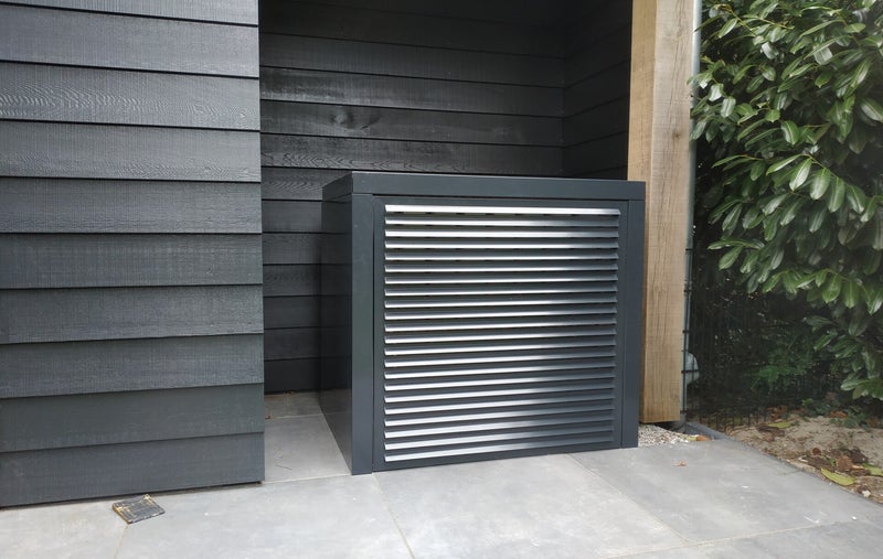Een warmtepomp omkasting (merk: Reducd) als mogelijke geluidsreducerende oplossing